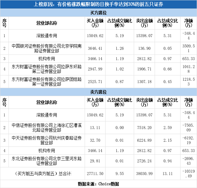 深交所2025年11月6日交易公开信息显示,双杰电气因属于有价格涨跌幅限制的日换手率达到30%的前五只证券而登上龙虎榜。双杰电气当日报收10.07元,涨跌幅为1.82%,换手率44.62%,振幅9.91%,成交额29.02亿元。