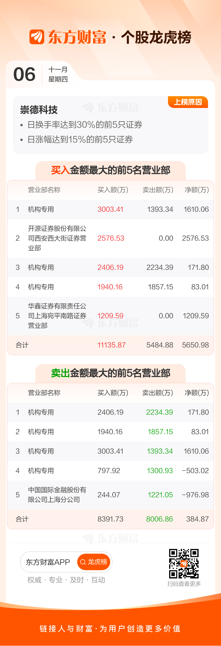 交易所2025年11月6日公布的交易公开信息显示,崇德科技因成为日换手率达到30%的前5只证券、日涨幅达到15%的前5只证券上榜。崇德科技当日收报61.59元,涨跌幅18.53%,偏离值46.28%,换手率46.28%,成交额7.25亿。