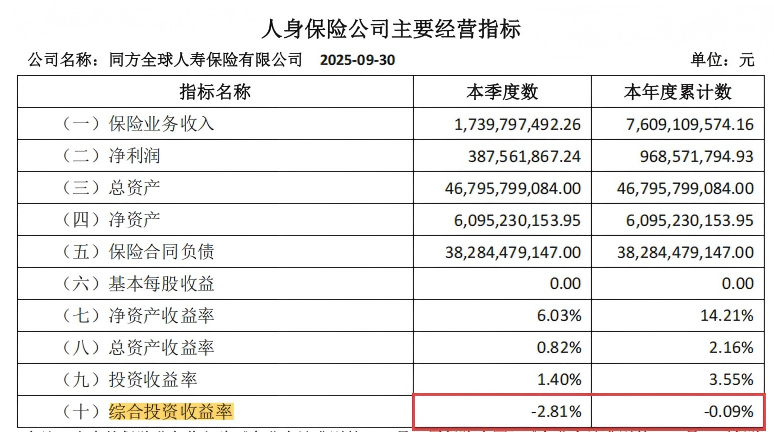 同方全球人寿保险日前发布的2025年第三季度偿付能力报告显示,其第三季度综合投资收益率为-2.81%、前三季度综合投资收益率为-0.09%,偿付能力环比下滑。公司提到核心原因是市场波动导致可供出售金融资产市值下降,拉低了投资收益总额。