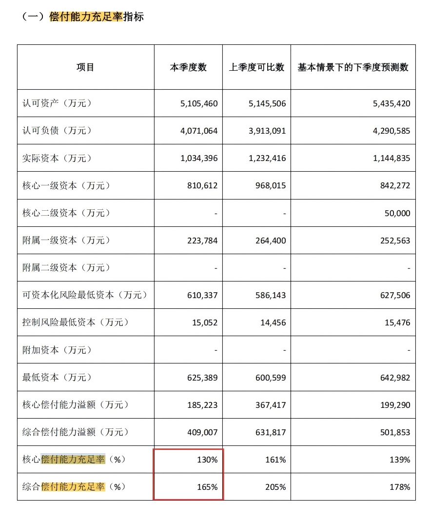 根据公司本次发布的偿付能力报告,受金融资产缩水、进入核心资本的保单未来盈余减少等核心资本与附属资本减少等因素影响,至今年三季度末,公司核心偿付能力充足率从第二季度末的161.18%下降至130%,综合偿付能力充足率从205.2%下降至165%,且均低于二季度预期值,依然高于监管要求。