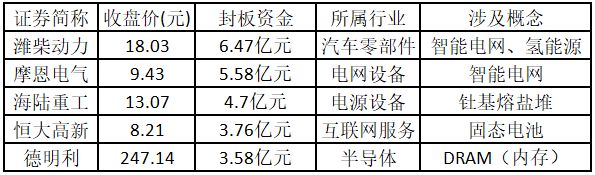 从封板资金来看,今日涨停板个股中,封板资金排名前5的个股包括潍柴动力、摩恩电气、海陆重工、恒大高新、德明利。