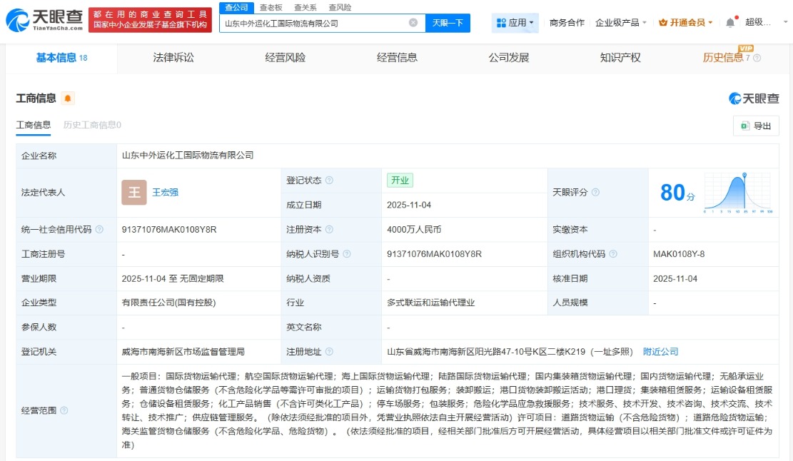 中外运化工国际物流等在山东成立新公司