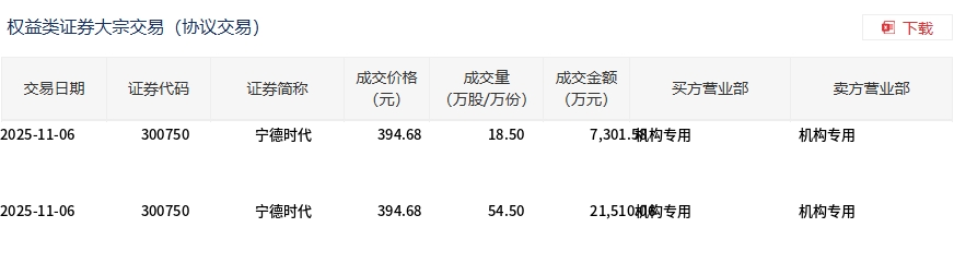 宁德时代今日大宗交易平价成交73万股,成交额2.88亿元