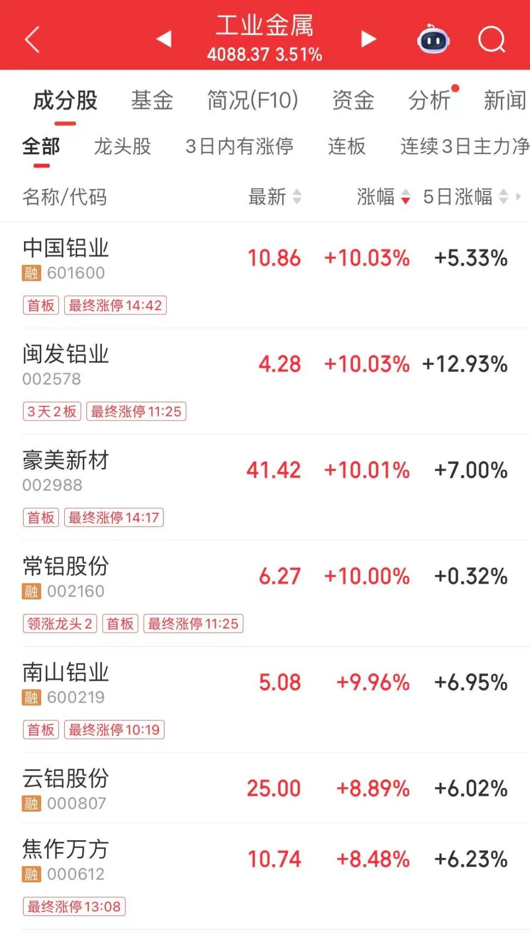 工业金属板块今天表现强势。其中,中国铝业、闽发铝业、豪美新材、常铝股份、南山铝业涨停,云铝股份、焦作万方涨超8%,神火股份涨超7%。