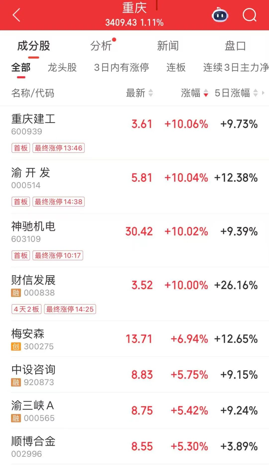 重庆板块午后拉升,其中,重庆建工、渝开发涨停。