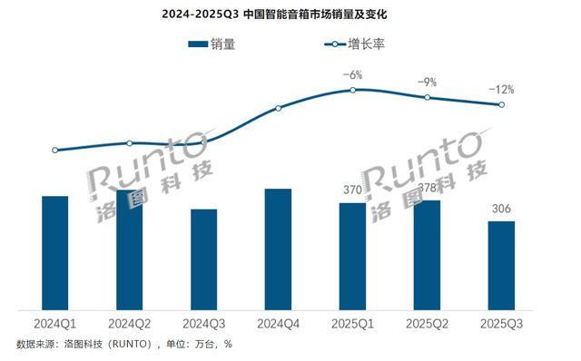 近日,据权威机构最新发布的报告显示,2025年第三季度的中国智能音箱全渠道销量305.7万台,同比下滑11.9%,前三季度市场持续调整。这与2020年巅峰时4020万台的年销量形成强烈反差,彼时行业年增长率高达125%,如今市场规模已缩水近六成。