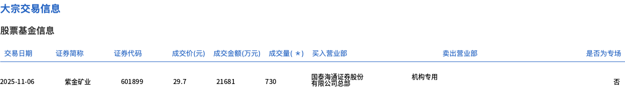 11月6日,紫金矿业大宗交易成交730万股,成交额2.17亿元,占当日总成交额的3.94%,成交价29.7元,较市场收盘价29.7元持平。