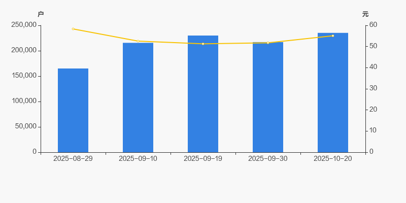 2025年8月29日至今,公司股东户数显著增长,区间涨幅为42.53%。2025年8月29日至2025年10月20日区间股价下降5.56%。