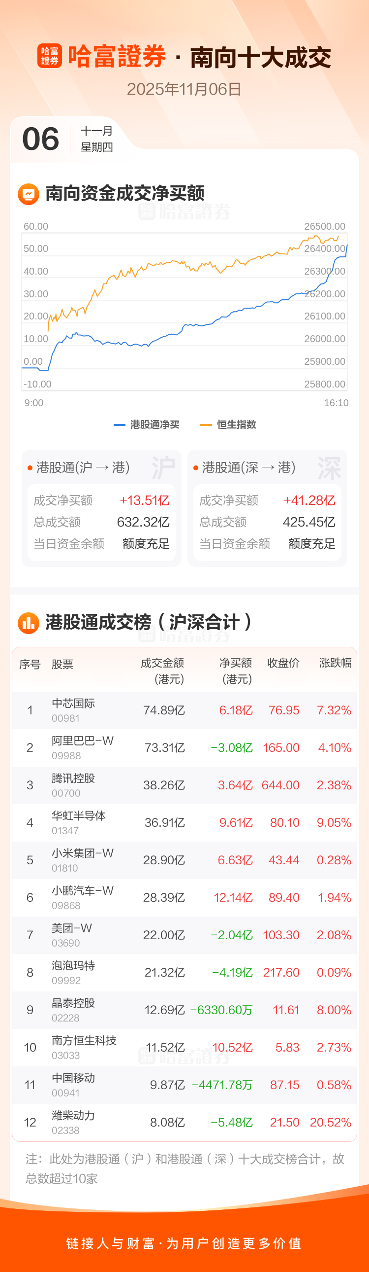 恒生指数11月6日涨2.12%,收报26485.9点。南向资金今日净买入港股54.79亿港元。南向资金今日成交额1057.77亿港元,港股大市成交2346.53亿港元。