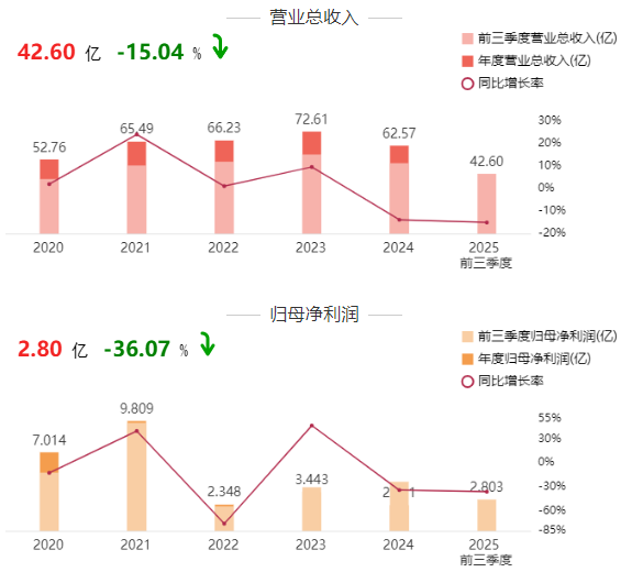 据三季报显示,前三季度公司实现营业收入42.60亿元,同比下滑15.04%;归母净利润2.80亿元,同比降幅达36.07%,扣非后净利润更是下滑43.27%,在2024年交出上市以来最差成绩单后,业绩失速态势未能扭转。