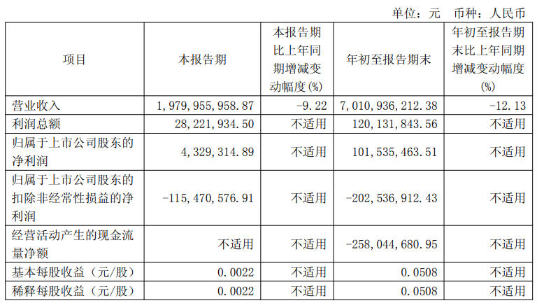 今年前三季度,公司实现营业收入为70.1亿元,同比下降12.1%;归母净利润自去年同期亏损1.15亿元后成功扭亏,实现归母净利润1.02亿元;扣非归母净利润自去年同期亏损3.0亿元变为亏损2.03亿元,亏损额有所减少;经营活动产生的现金流量净额为-2.58亿元,上年同期为-23.14亿元。
