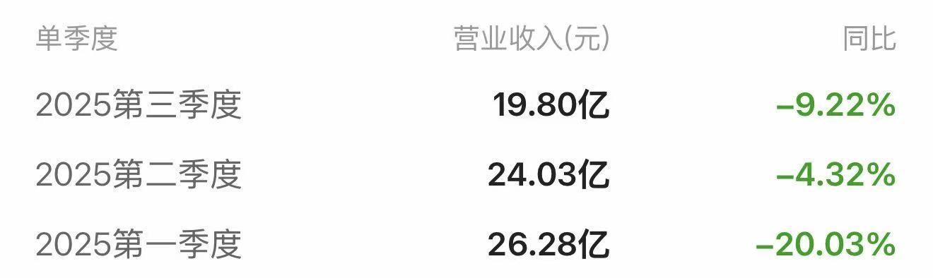 今年第一季度、第二季度、第三季度,公司分别实现营业收入26.28亿元、24.03亿元和19.8亿元,同比降幅分别为20.03%、4.32%和9.22%,环比降幅分别为11.17%、8.58%和17.59%,无论是同比还是环比均为下降趋势。