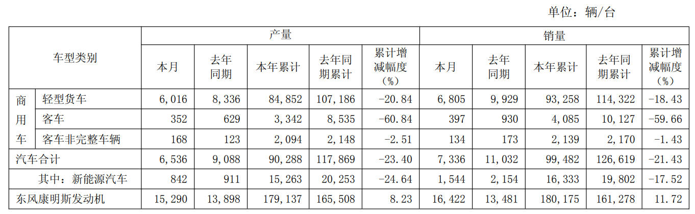 11月6日,东风股份(600006)发布10月份产销数据快报,当月,整体汽车合计的产量为6536辆,去年同期为9088辆;销量为7336辆,去年同期为11032辆。其中,客车单月的销量仅为397辆。