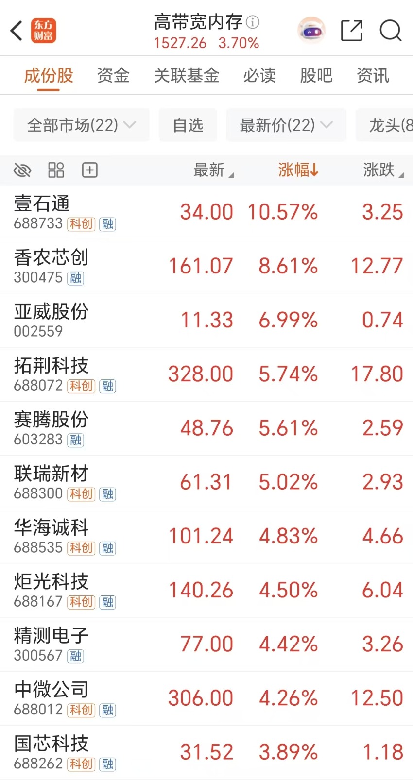 周四(11月6日)存储概念股大涨,壹石通20CM涨停,德明利涨停,香农芯创涨近9%,亚威股份、拓荆科技等多股跟涨。