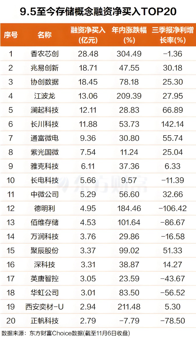 东方财富Choice数据显示,存储概念指数自9月5日企稳上行以来,杠杆资金抢筹多只存储概念股,其中香农芯创排名第一,区间融资净买入超28亿元,该股年内涨幅超340%;兆易创新排名第二,融资净买入接近19亿元,年内涨幅超47%。