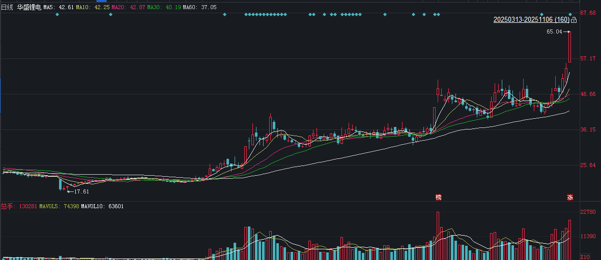 11月6日盘后,华盛锂电(688353)发布股票交易异常波动公告称,公司股票交易价格连续三个交易日内收盘价格涨幅偏离值累计达到30%。截至收盘,华盛锂电“20cm”涨停报65.04元/股,今年来已累计上涨178%。