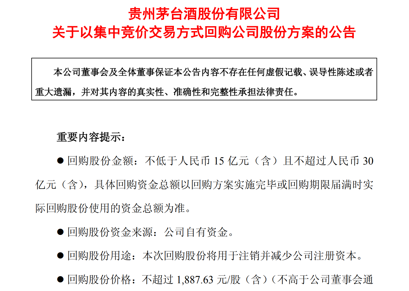 同时,贵州茅台还宣布,计划以集中竞价交易方式回购股份,资金总额不低于15亿元且不超过30亿元,回购价格不超过1887.63元/股。回购的股份将用于注销并减少公司注册资本。