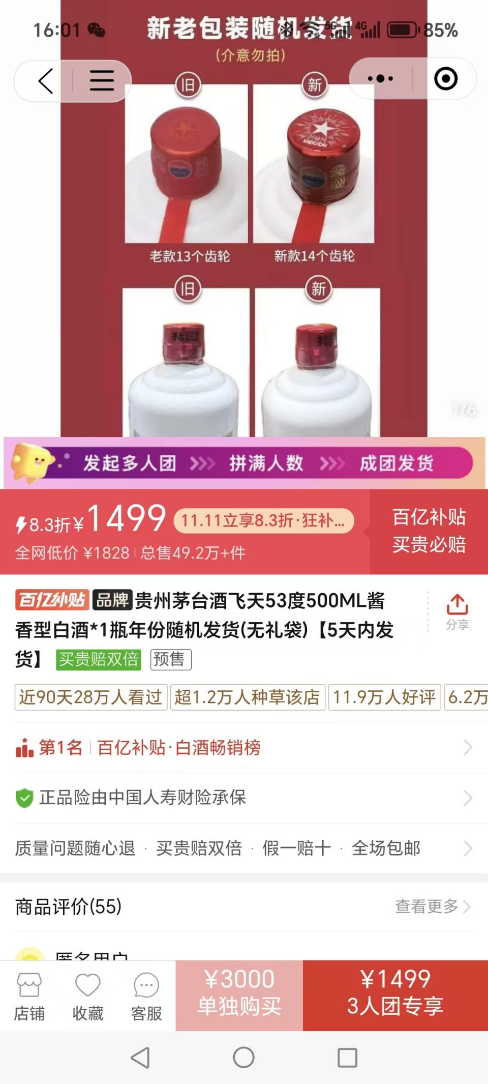 根据电商平台的信息,经过补贴后,3人团购,一瓶53度飞天茅台500ml的价格为1499元/瓶;且活动页面显示,中国人寿财险承保产品的正品险。