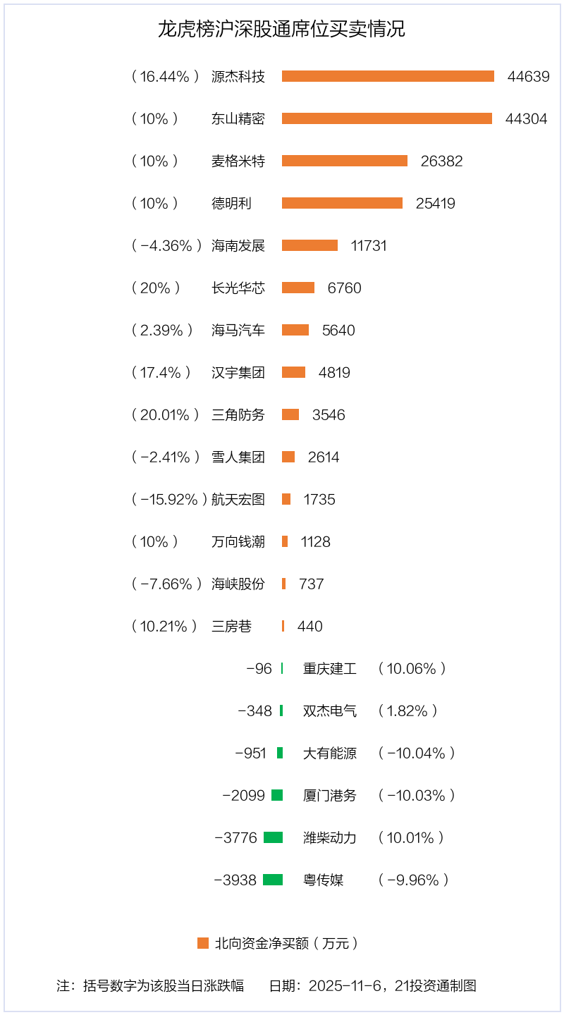 北向资金净买入金额最多的是源杰科技(688498.SH),净买入4.46亿元,占总成交金额的12.05%。净卖出金额最多的是粤传媒(002181.SZ),为3937.79万元,占总成交金额的3.98%,当日收盘下跌9.96%,换手率为7.21%。