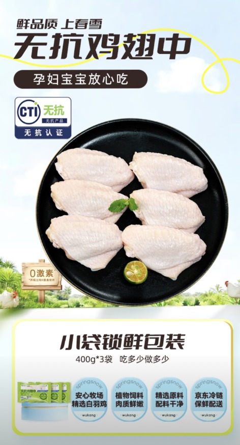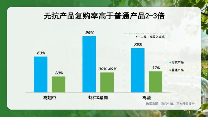 这一点在市场端也得到了验证。京东生鲜数据显示,无抗产品凭借食品安全溢价形成强用户粘性,复购率普遍高于普通产品2-3倍。从细分品类来看,无抗鸡翅中复购率达63%,是普通冻品禽肉行业均值的2.25倍;而无抗白虾仁、无抗猪肉复购率则高达99%,而普通同类产品复购率多在30%-40%之间。