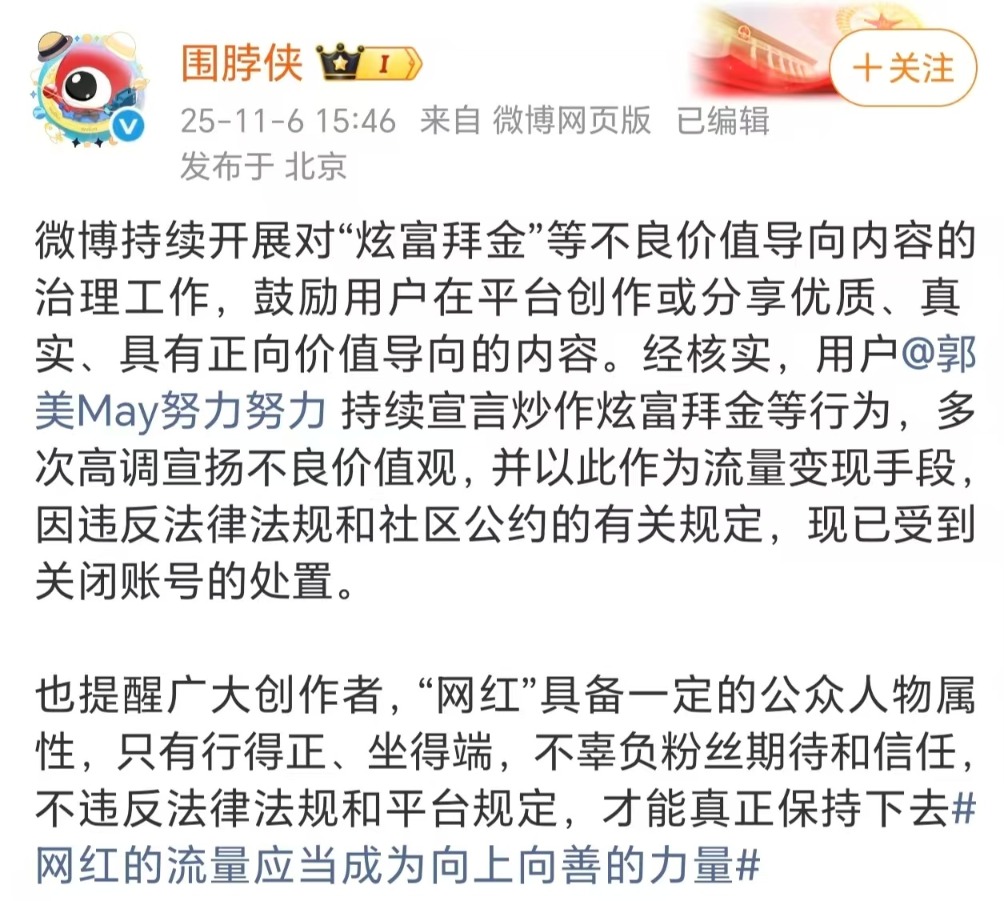 11月6日,微博官方账号围脖侠发文称,用户“郭美May努力努力”持续炒作炫富拜金等行为,多次高调宣扬不良价值观,并以此作为流量变现手段,因违反法律法规和社区公约的有关规定,现已受到关闭账号的处置。