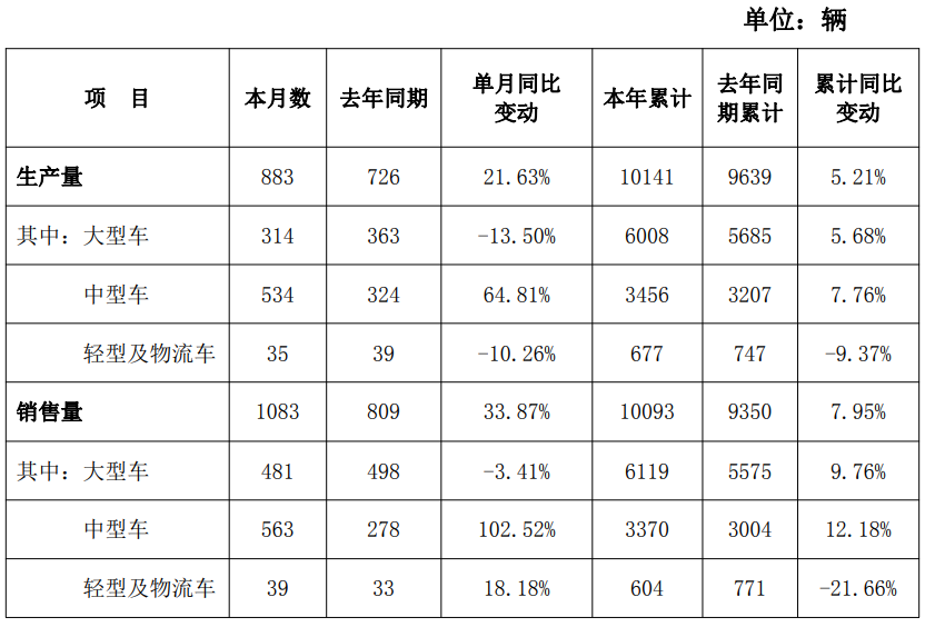 11月6日,中通客车(000957)发布公告,截至2025年10月份的产销数据快报显示,生产量为883辆,同比增加21.63%;销售量为1083辆,同比增加33.87%。具体表现如下: