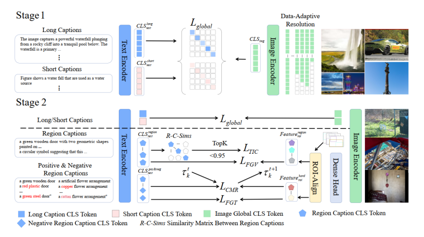 在训练方法上,模型采用了革命性的两阶段策略。其关键的第二阶段摒弃了传统CLIP的“整体对整体”的粗放对齐模式,升级为“局部对局部”的精细对齐,这正是其实现细粒度理解的精髓所在。