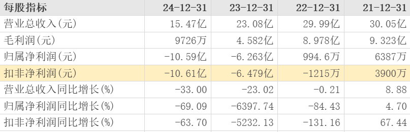 虽然广电网络摘掉了ST的帽子,但公司近年来陷入亏损困境。2022年至2024年,公司扣非净利润分别为-1215.12万元、-6.48亿元、-10.61亿元;同时,营收也连续三年下滑,由2021年的超30亿元一路下滑至2024年的15.47亿元。