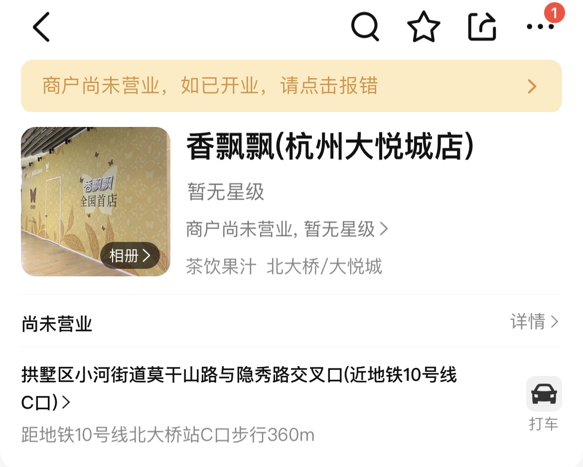 查询大众点评网的店铺信息,香飘飘(杭州大悦城店)尚未营业,经营品类为“茶饮果汁”。
