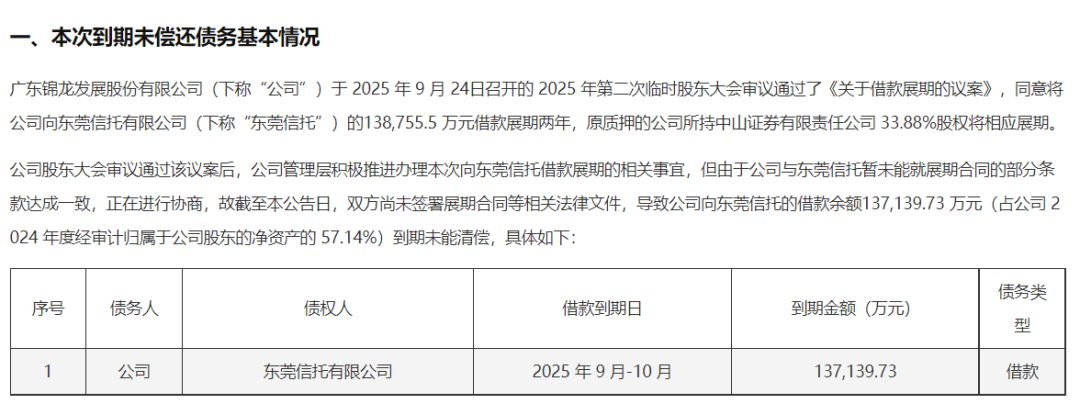 10月28日,锦龙股份发布了《关于部分债务到期未能清偿的公告》。公告显示,锦龙股份欠东莞信托约13.88亿元的债务准备展期2年,公司内部已通过了展期议案。但公司目前并未能与东莞信托就展期部分条款达成一致,导致借款到期未能清偿。公司将积极协商,力争尽快签署展期合同。