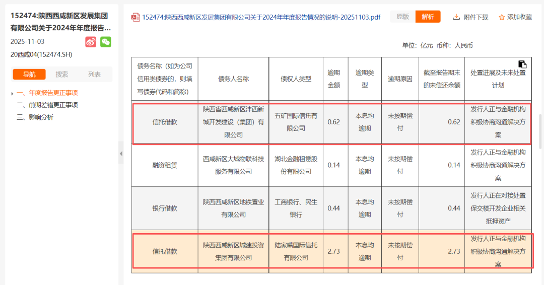 11月3日,西咸集团发布公告,就公司2024年年度报告相关内容进行更正和说明,该公告曝光了子公司的两笔逾期信托借款。