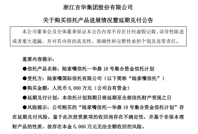 据公告,吉华集团于2021年购买《陆家嘴信托—华鼎18号集合资金信托计划》,金额为5000万元,信托资金拟投资于债务人拟以非公开发行的方式发行的总金额不超过150000 万元且期限为24个月的2020年私募债券1号。债务人将受托人投资各期债券交付的投资资金用于标的项目的开发建设,该产品到期日为2022年12月15日,预期收益率为7.1%。不过,截至持有期届满,公司未收到陆家嘴信托理财产品的本金及部分理财收益。