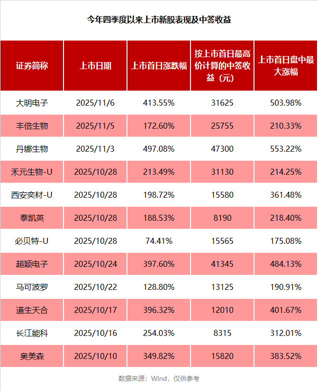 除了上市首日表现较好外,四季度以来A股市场新股中签收益也较为可观,并继续出现一些中签收益较高的肉签。