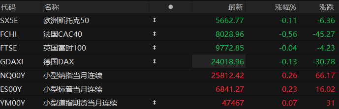周四盘前,美股三大股指期货齐涨,欧洲主要指数普遍下跌。截至发稿,纳斯达克100指数期货涨0.26%,标普500指数期货涨0.23%,道指期货涨0.07%。