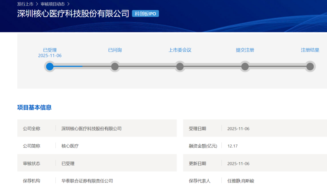 11月6日,上交所受理了深圳核心医疗科技股份有限公司(以下简称“核心医疗”)的科创板IPO申请,成为科创板第五套上市标准重启后,首家获受理的创新医疗器械企业。招股说明书显示,核心医疗获多家资深专业机构投资者投资。