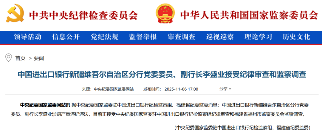 11月6日,中央纪委国家监委官网通报:中国进出口银行新疆维吾尔自治区分行党委委员、副行长李盛业涉嫌严重违纪违法,目前正接受中央纪委国家监委驻中国进出口银行纪检监察组纪律审查和福建省福州市监察委员会监察调查。