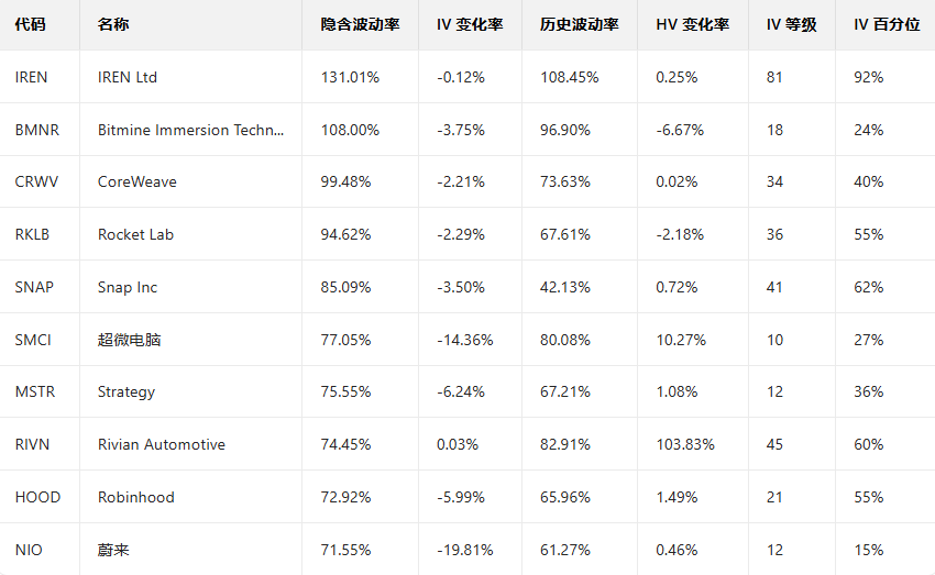 美股引申波动幅度排行榜前十(标的市值>100亿美元,且期权成交量>10万美元)