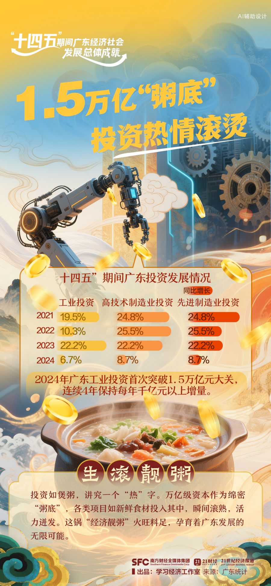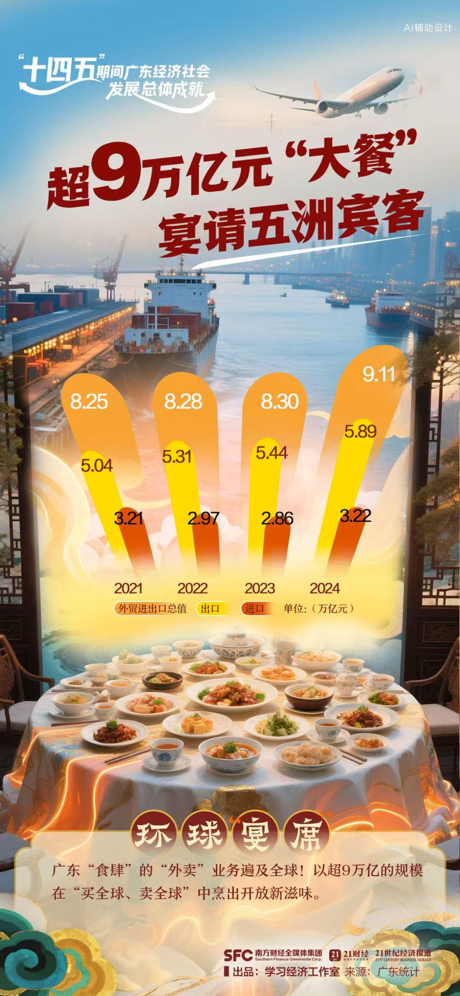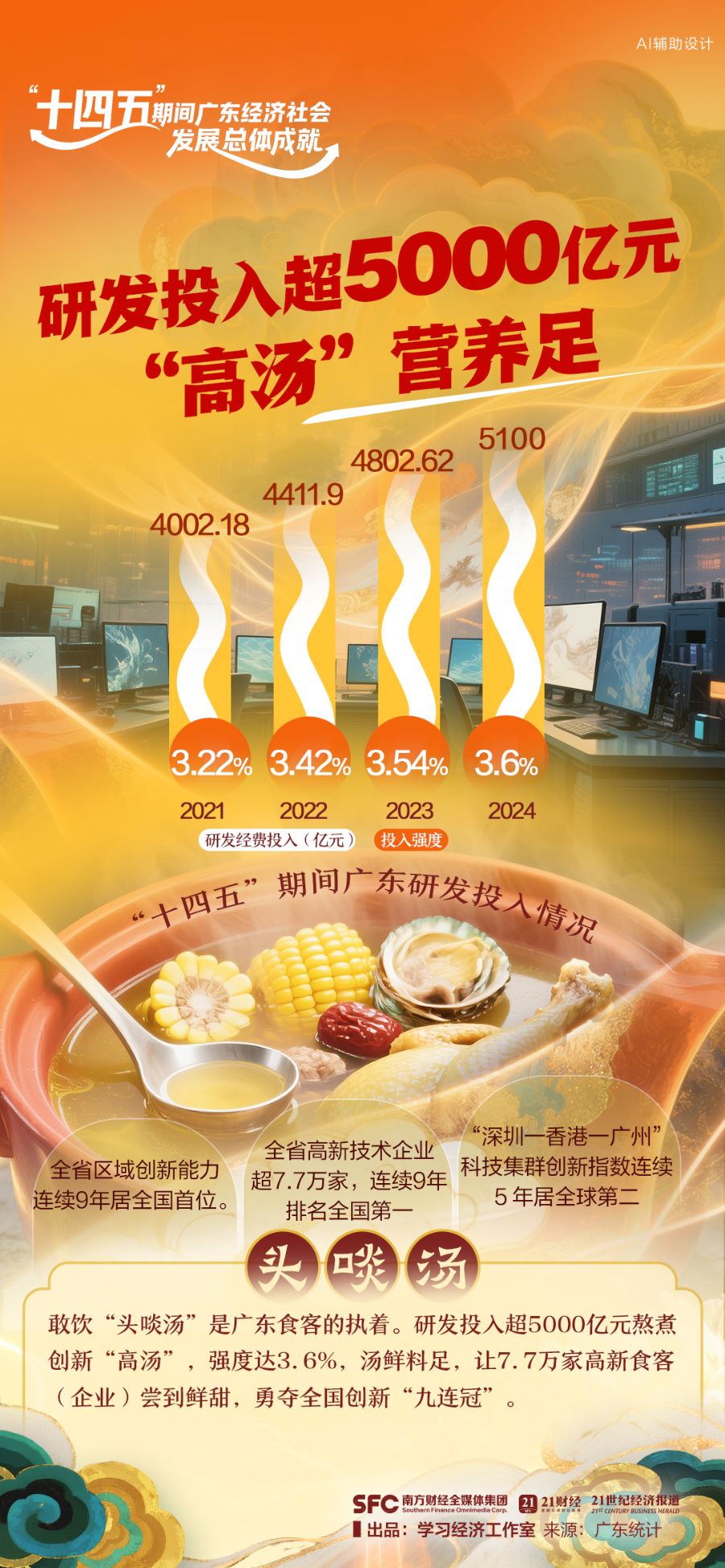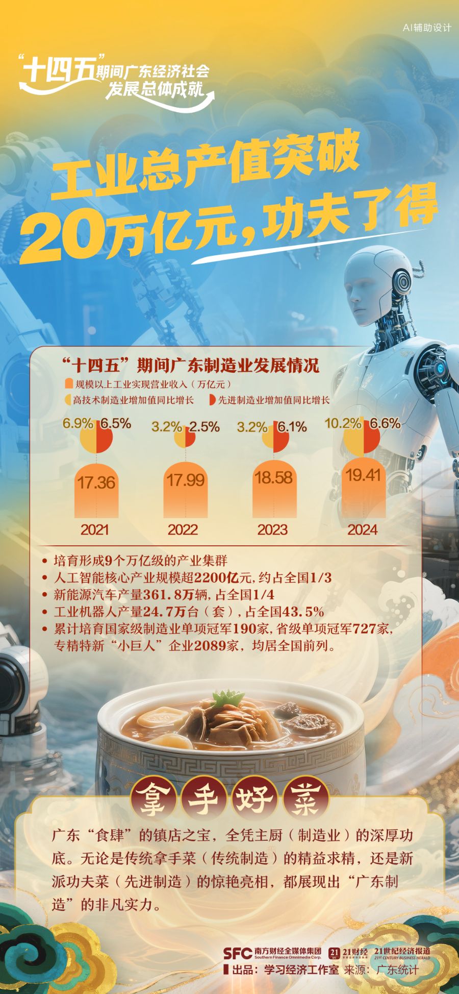 “十四五”期间,广东这间“食肆”,以制造为“拿手好菜”,以服务为“暖心后厨”,火候十足地煲出了高质量发展的醇厚底味,献上一席色香味俱全的发展盛宴。9道招牌菜为你揭晓>>>