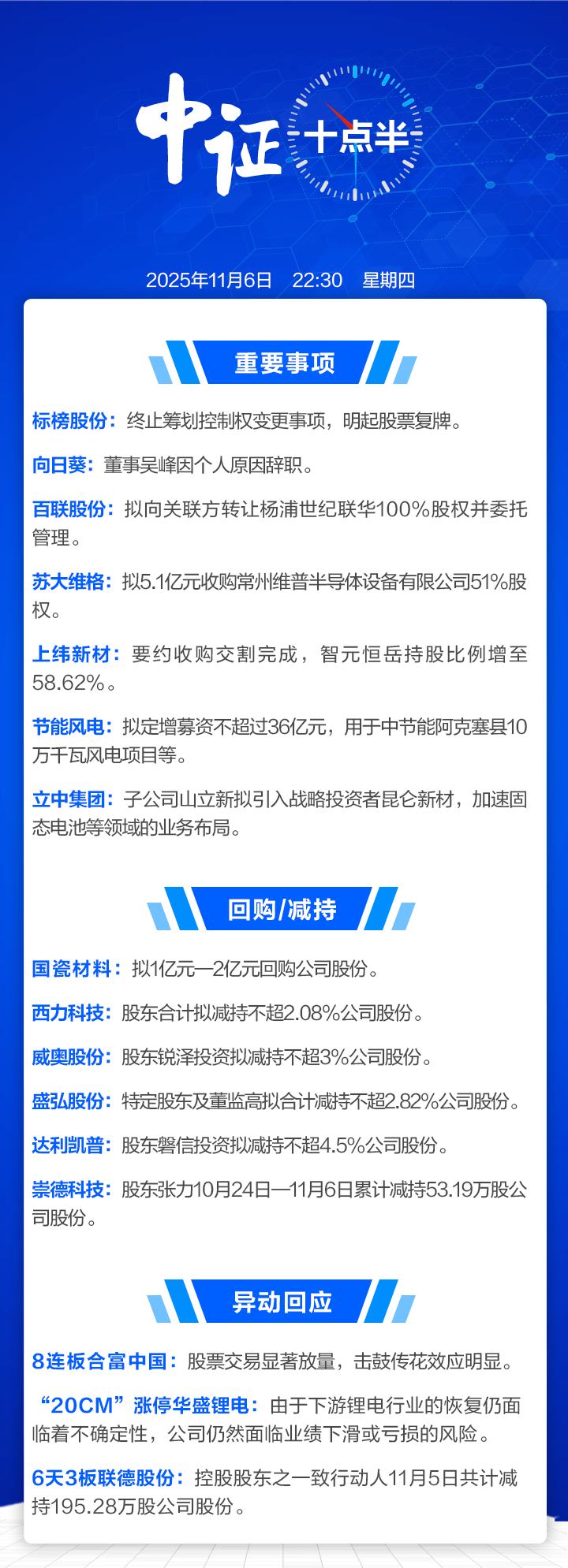 【中证十点半】苏大维格拟收购常州维普半导体设备51%股权;标榜股份:终止筹划控制权变更事项