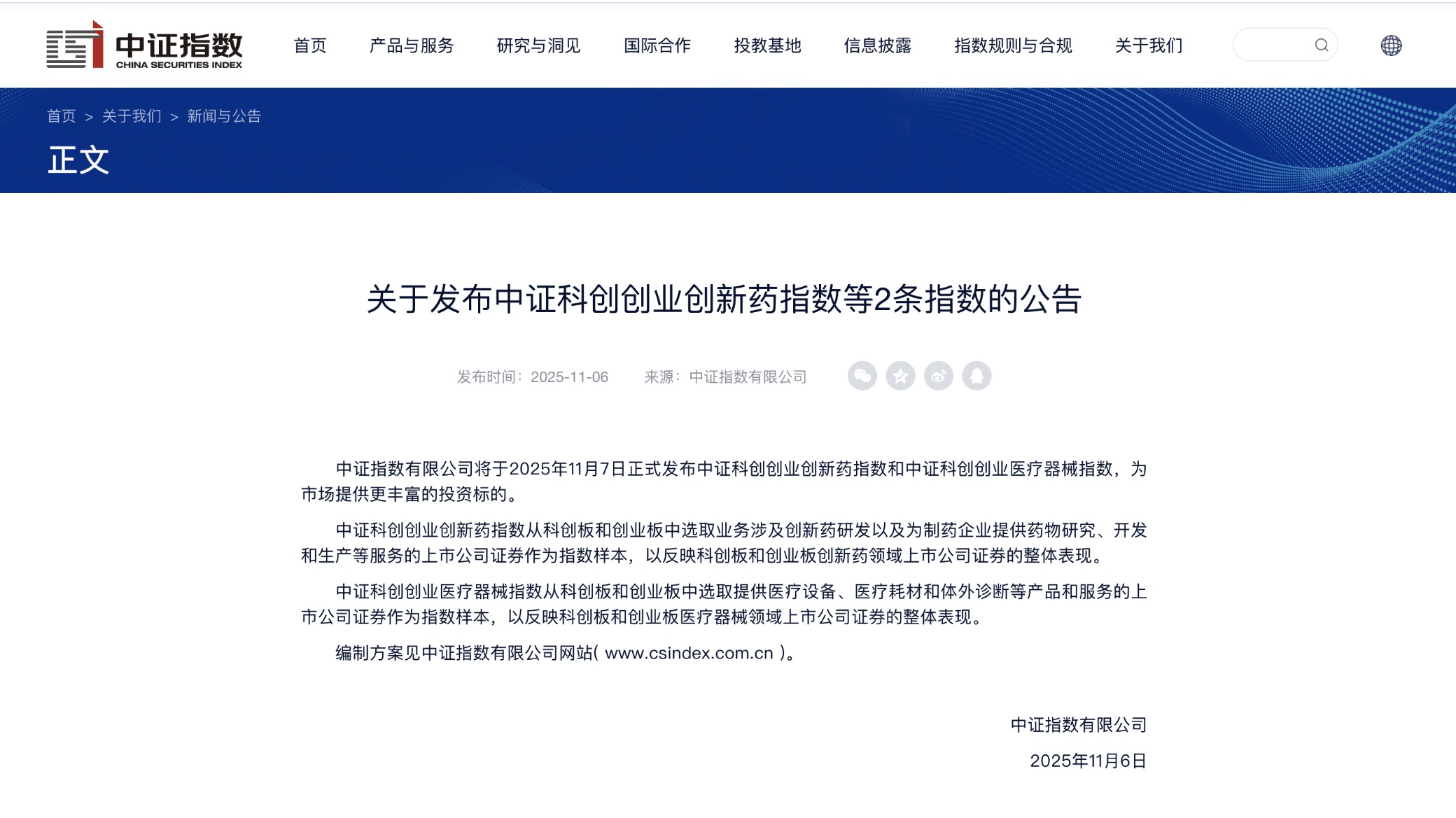 11月6日,中证指数有限公司公告称,将于2025年11月7日正式发布中证科创创业创新药指数和中证科创创业医疗器械指数,为市场提供更丰富的投资标的。