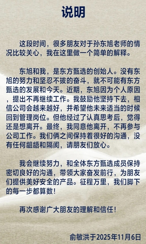 11月6日,新东方创始人、东方甄选行政总裁俞敏洪在其社交平台发布的一则说明称,东方甄选前CEO(首席执行官)孙东旭已正式离职。