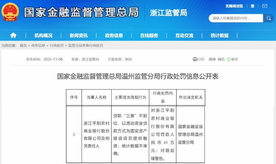 11月6日,国家金融监督管理总局温州监管分局披露的行政处罚信息公开表显示,浙江平阳农村商业银行股份有限公司因贷款“三查”不到位,以流动资金贷款方式为固定资产建设项目提供融资,统计数据不准确,被国家金融监督管理总局温州监管分局罚款人民币65万元;对易剑锋警告。