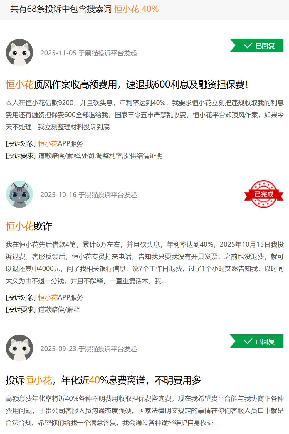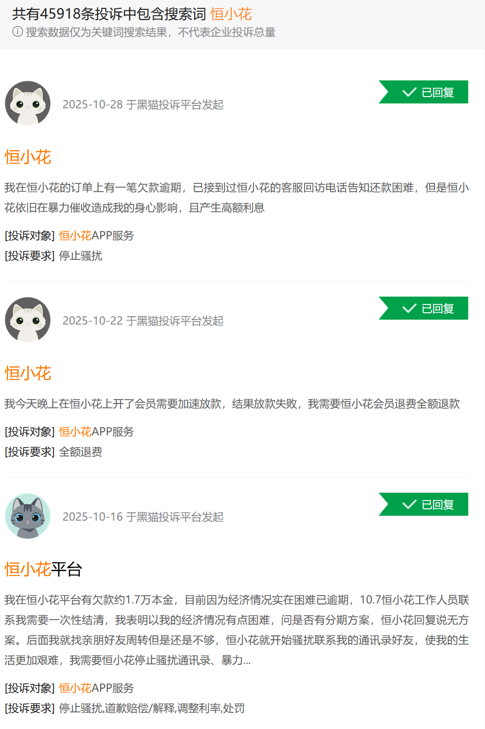2024年以来,关于“恒小花”“恒生活借款”等App的投诉持续攀升。涉及内容包括高额费用、暴力催收、信息泄露、提前结清困难等。仅黑猫投诉平台相关条目即达4.6万条。