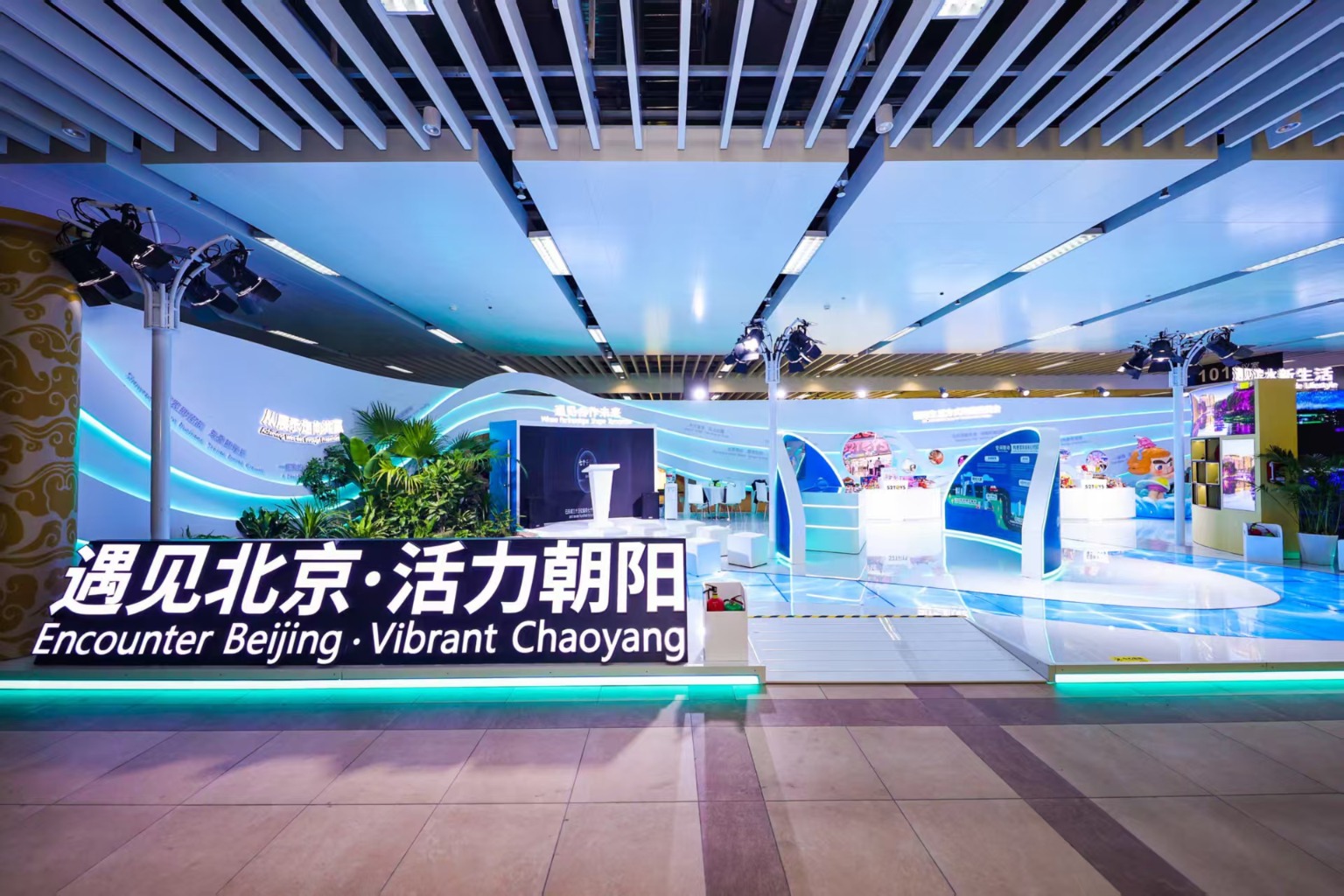 本届进博会人文交流活动北京展区占地360平方米,以“遇见北京·活力朝阳”为主题,紧密围绕朝阳区“一纵一横一核”的消费空间发展格局,通过前沿的沉浸式设计,打造了一幅可步入、可感知的“国际消费中心城市主承载区立体画卷”,多维度展示了北京市国际消费中心城市建设的生动实践。展区的整体叙事逻辑清晰地呈现了朝阳区纵向打造地铁14号线商业带、横向打造亮马河文化经济带、建设CBD×三里屯国际消费体验区的消费战略,划分为遇见北京活力朝阳、遇见都市脉搏、遇见24小时的活力、遇见滨水新生活、遇见世界引擎、遇见合作未来六个展示板块。