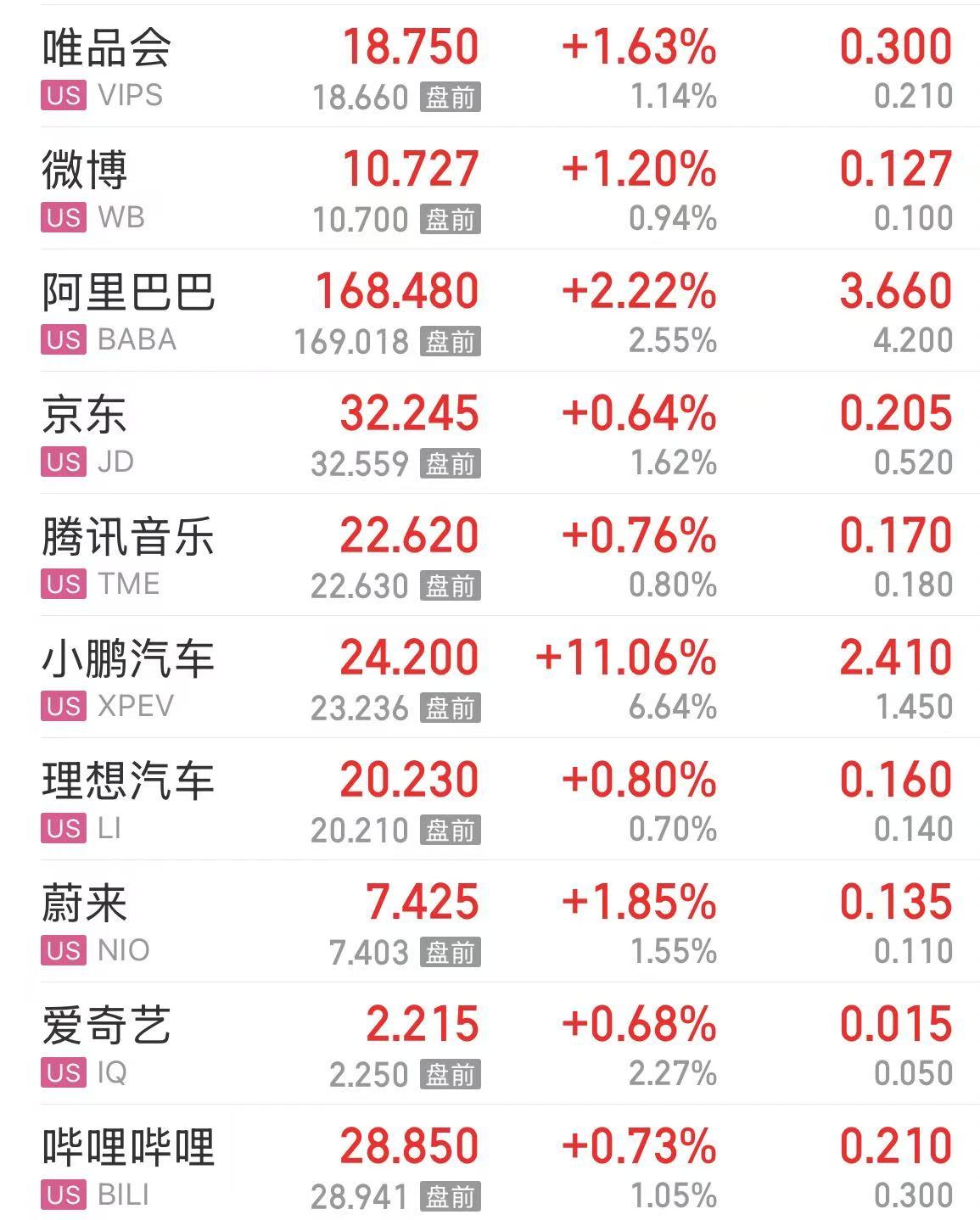 热门中概股多数上涨,纳斯达克中国金龙指数一度涨超2%。小鹏汽车涨超11%,阿里巴巴涨超2%,蔚来、唯品会、微博、爱奇艺、京东等上涨。