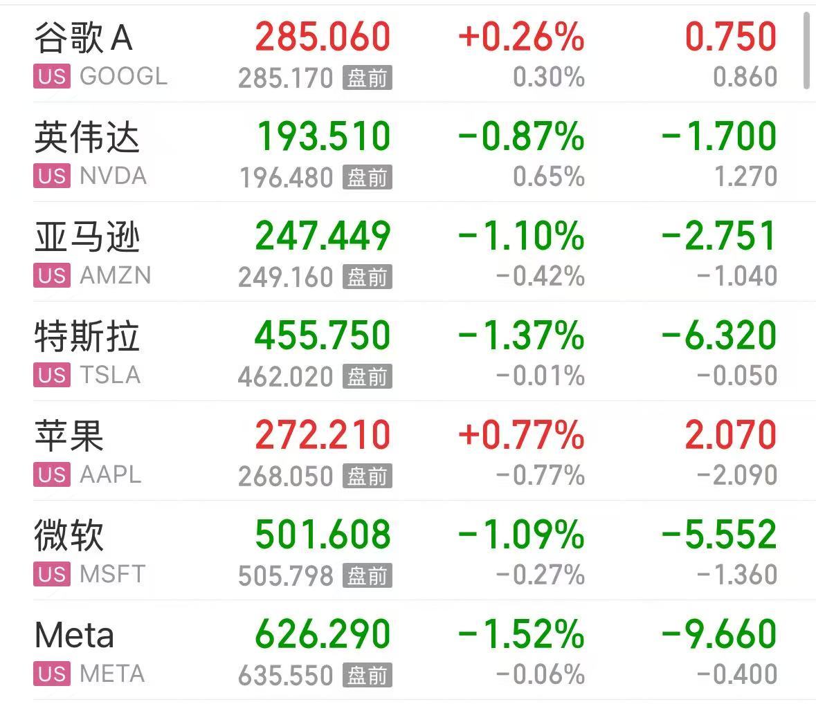 大型科技股多数下跌,亚马逊、特斯拉、微软、Meta跌超1%,英伟达微跌,谷歌、苹果微涨。