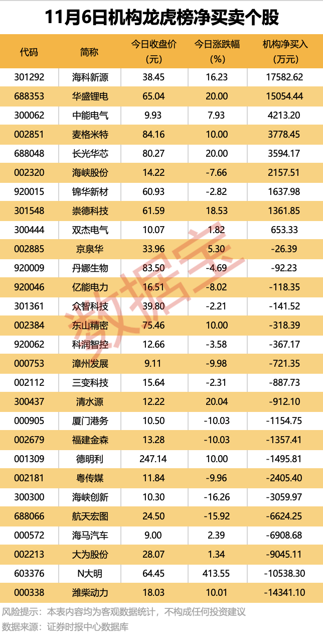 今日龙虎榜中,净买入个股有9只,净卖出的个股为19只。8股净买入金额均超千万元,海科新源获机构净买入1.76亿元,居首;其次是华盛锂电、中能电气、麦格米特,均获净买入超3000万元。