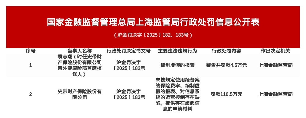 蓝鲸新闻11月6日讯,近日,上海金融监管局发布了罚单,剑指史带财产保险股份有限公司及其相关责任人。