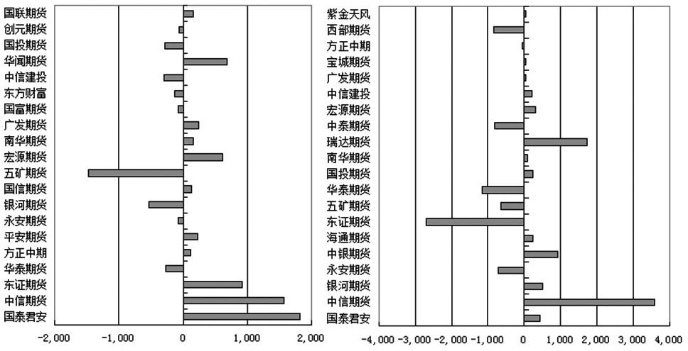 空头前20席位中,增持空单的有13家。其中,增持空单数量超过1000手的有2家,分别为中信期货席位和瑞达期货席位,分别大幅增加3596手和1744手。另外,增持空单数量介于100手至1000手之间的有7家,分别为国泰君安期货席位、银河期货席位、中银期货席位、海通期货席位、国投期货席位、宏源期货席位和中信建投期货席位,分别增加432手、519手、932手、248手、237手、307手和219手。剩余4家增持不足100手。
