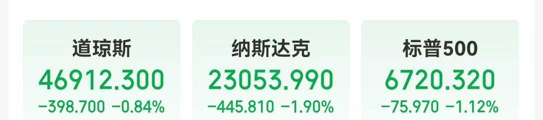 当地时间11月6日,美股三大指数集体收跌,纳指下跌445.81点,跌幅1.90%;标普500指数跌1.12%;道指跌0.84%。